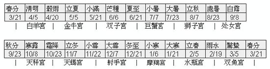 黃道十二宮(十二星座)與二十四節氣的關係如下: